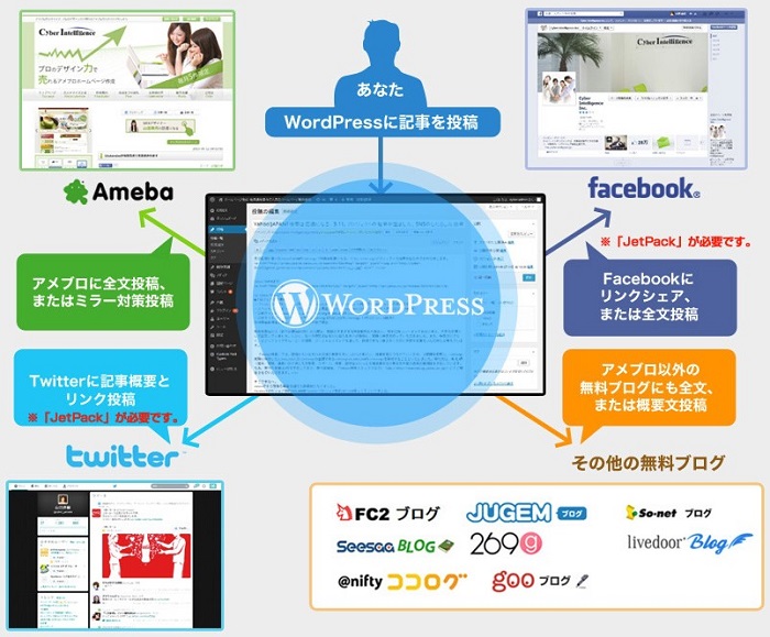 アメーバキングとWordpressを連携、さらにWordpress公式の無料プラグイン(JetPack)を組み込めば、1つのブログを軸にしてほぼすべてのメディアを一括管理することが可能になります!